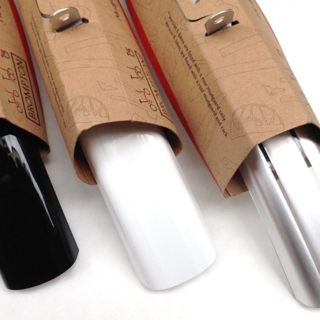 Valkoinen takalokasuoja Brompton pyörään tuo Brompton pyöräsi värit hienosti esiin. Tässä mallissa ei ole kiinnikkeitä mukana, saat ne erikseen tilaamalla tai jos sinulla on jo vastaava lokasuoja voit vaihtaa kiinnikkeet helposti itse. Tilattavana on myös titaaniset lokasuojan aisat.