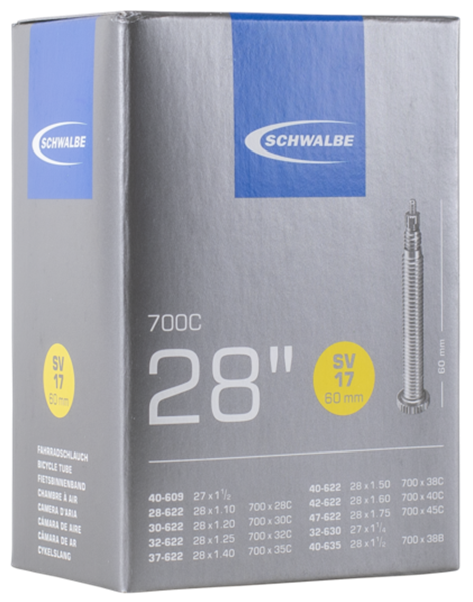 Schwalbe SV17 polkupyörän sisärengas 28″ (28-47mm) on laadukas perustason sisärengas cyclocross-pyöriin, hybrideihin ja muihin keskileveällä (28-47 mm) 28″ renkaalla varustettuihin pyöriin. Sisärengas on varustettu prestaventiilillä.