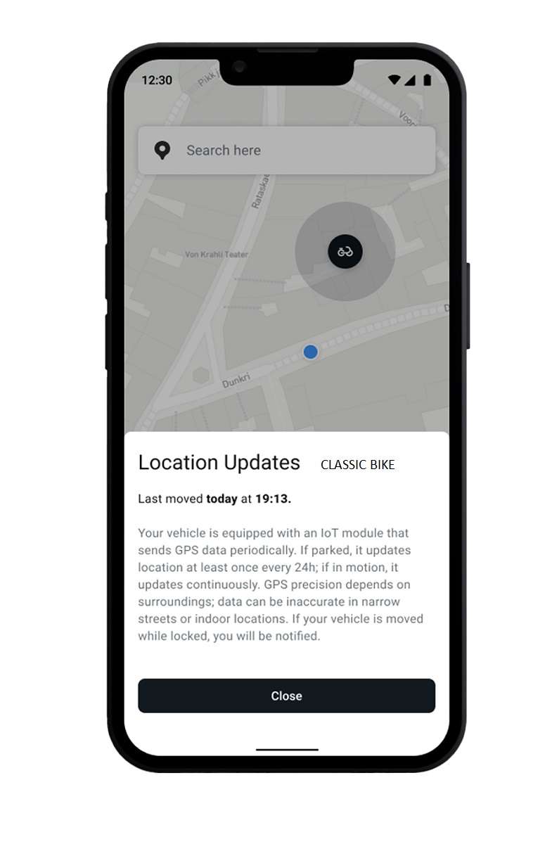 Seuraa Christiania-pyörääsi reaaliajassa Christiania Bikes -sovelluksen kautta. Pyörän sijainti päivittyy reaaliajassa, kun pyörä on liikkeessä, ja näyttää käyttäjälle viimeisen liikkeen ajankohdan.