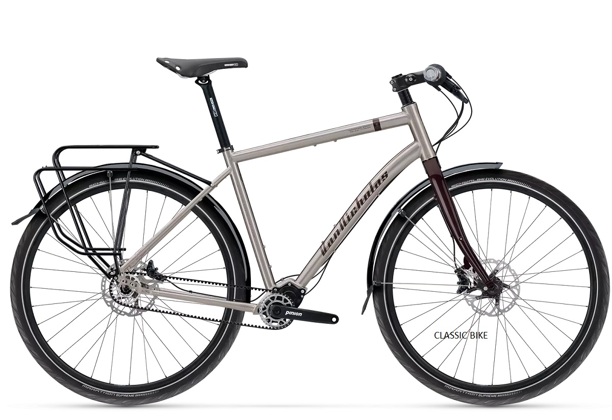 Van Nicholas Deveron hihnavedolla ja Pinion P.18 vaihteistolla on luonnollisesti huippuvalinta huoltovapautensa ja toimintavarmuutensa vuoksi. Itse runko on valmistettu 3Al/2.5V (3% alumiini, 2.5% vanadium) – titaanista ja valmistaja myöntää rungolle elinikäisen runkotakuun. Van Nicholas Deveron Pinion titaanirunkoinen retkipyörä kuuluu valmistajan Trekking- sarjaan ja mikäli haluat toimintavarman, pitkäikäisen ja tyylikkään retki- tai työmatkapyörän Deveron on oikea valinta. Yksinkertaistettuna kyse on pyörästä, jolla on tarkoitus ajaa pitkiä matkoja tai nautiskella vaan laadukkaasta ja vauhdikkaasta pyörästä.