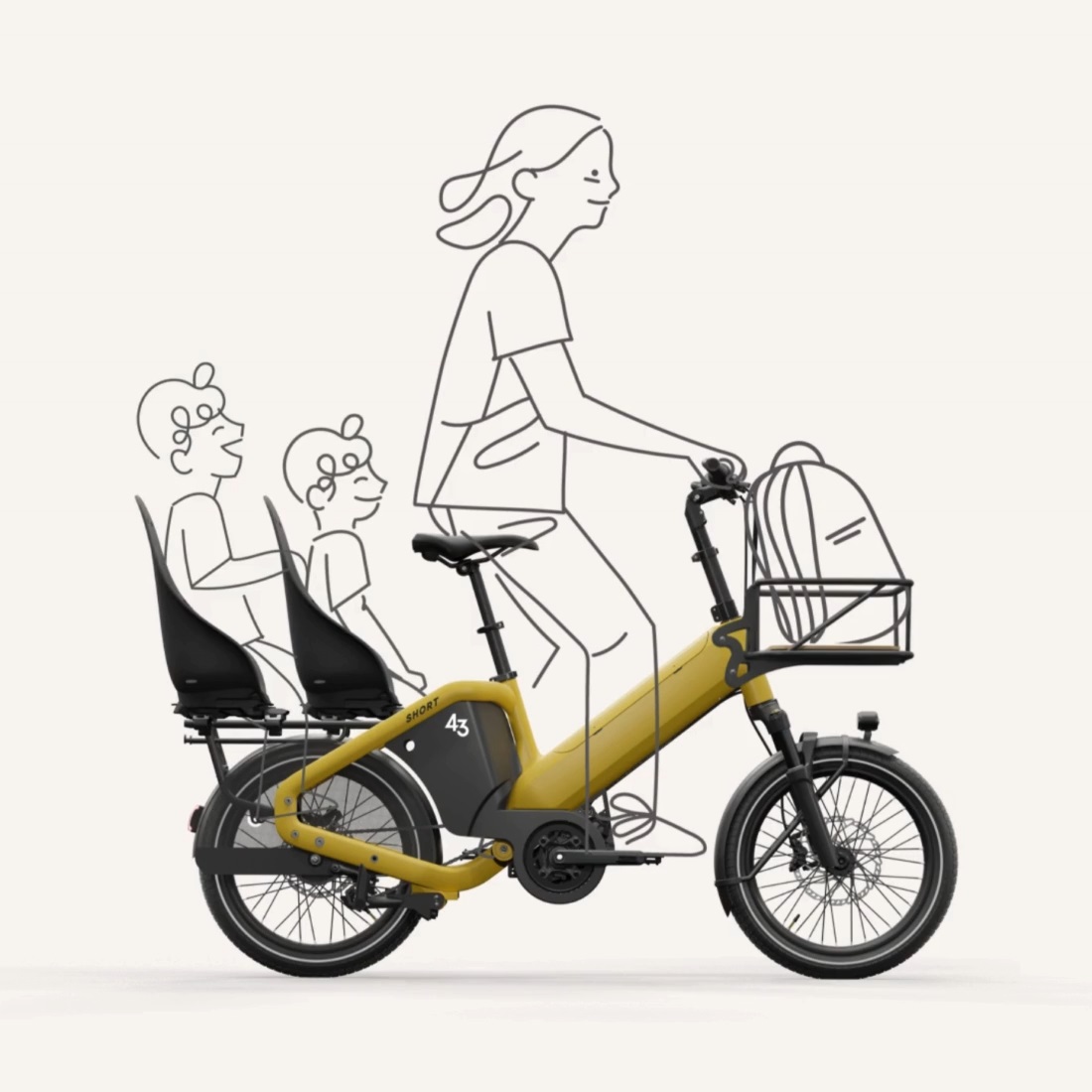Kaikki Bike43 – lisävarusteet ovat toimivia ja tehty helpottamaan päivittäistä arkea. Kuvan Bench Kit- tarjoaa toimivan ratkaisun kahden lapsen kuljettamiseen jotka eivät tarvitse enää erillisä lastenistuimia. Nousevan turvakaaren ansiosta pyörän kuormaus on helppoa ja nopeaa.