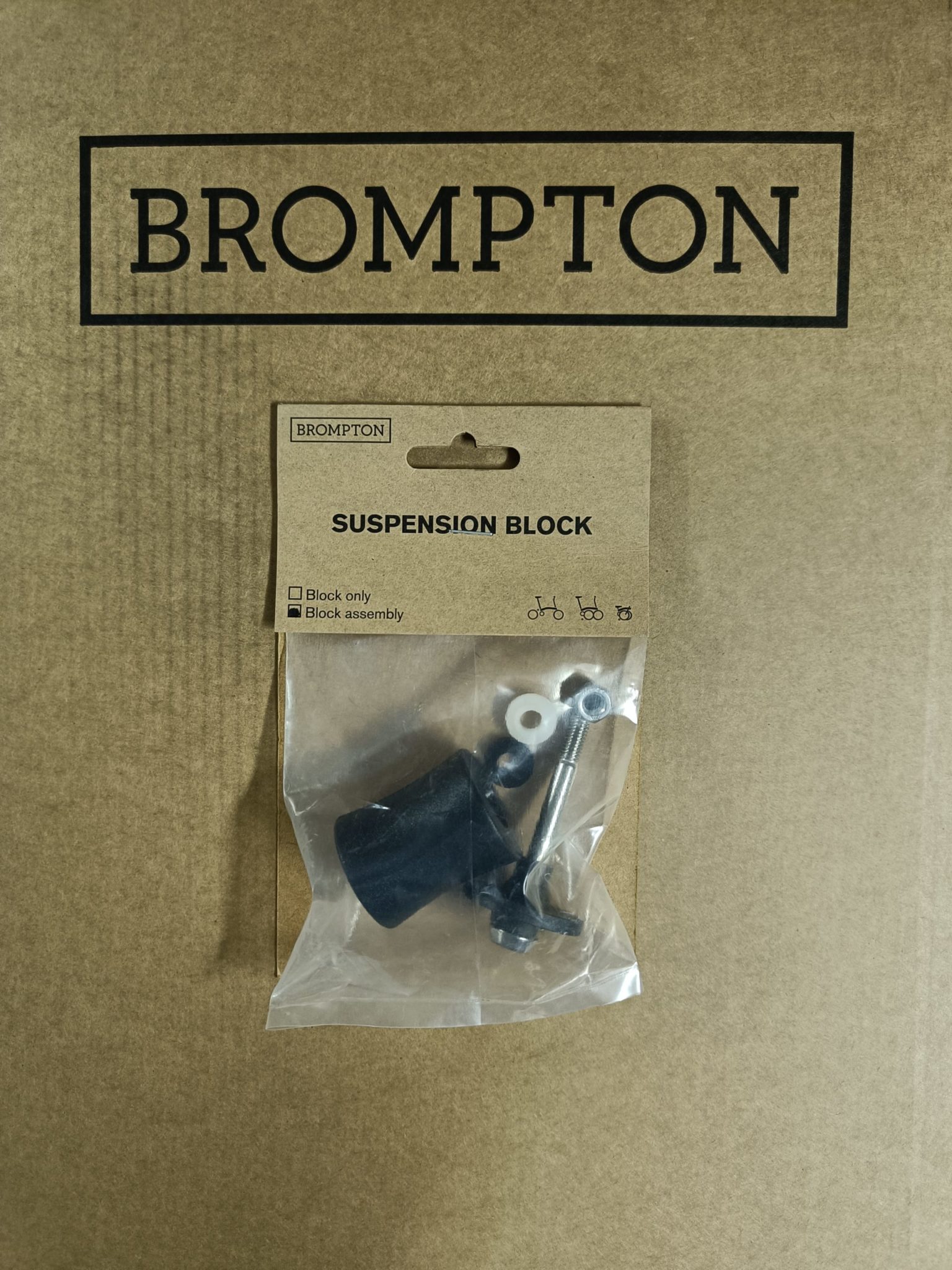 Tämä elastomeeri toimii Bromptonin takajousituksena ja pehmentää menoa epätasaisella alustalla. Mikäli elastomeerisi ei enää palaudu levossa normaaliin muotoonsa on se vaihdettava ja tästä saat helposti uuden kokonaisuuden. Saatavilla on myös pelkkä elastomeeri ilman kiinnikkeitä. Kun vaihdat elastomeeriä, laita hieman rasvaa läpi menevään pulttiin, niin kumin ja metallinen välinen kitka jää pieneksi.